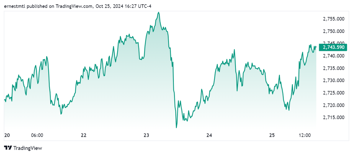Giá vàng tương lai giao tháng 12/2024 trên sàn Comex New York tăng 5,7 USD, tương ứng tăng 0,21% lên mức 2.754,6 USD/ounce. Tính chung cả tuần, giá vàng giao ngay tăng 24,6 USD/ounce, tương ứng tăng 0,9%.