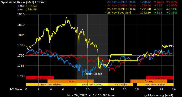 Giá vàng thế giới phiên ngày thứ Sáu chỉ tăng nhẹ không đáng kể, khi mà thị trường giao dịch vàng lớn nhất thế giới là Mỹ nghỉ giao dịch dịp lễ Tạ ơn.