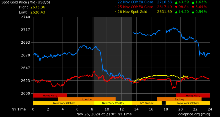 Giá vàng tương lai giao tháng 12/2024 trên sàn Comex New York tăng nhẹ 2,8 USD, tương ứng tăng 0,11% lên mức 2.621,3 USD/ounce.