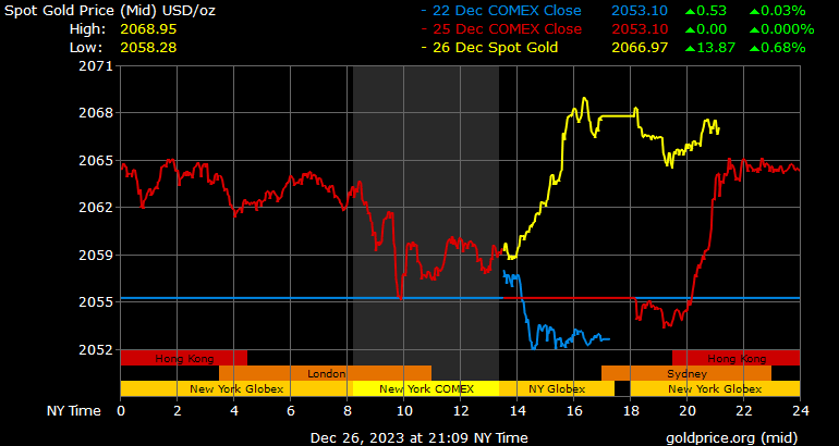 Giá vàng tương lai giao tháng 2/2024 trên sàn Comex New York tăng nhẹ 0,7 USD, tương ứng tăng 0,03% lên 2.069,8 USD/ounce.