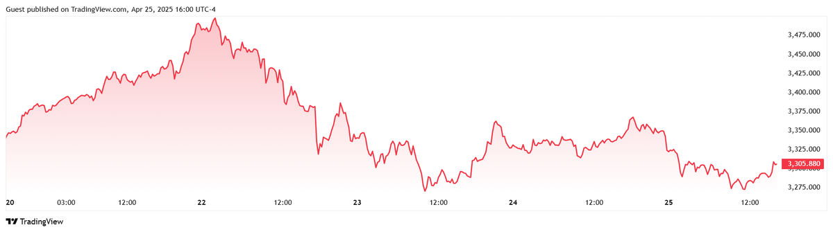 Vàng vừa đón nhận tuần biến động mạnh khi cuộc chiến thương mại của Trump tiếp tục chi phối diễn biến giá. Trong đó, sau khi tăng vọt lên mức cao nhất 3.500 USD/ounce vào đầu tuần, đã đẩy vàng vào vùng quá mua và giống như nhiều tài sản khác, kim loại quý này đã dễ bị thoái lui.