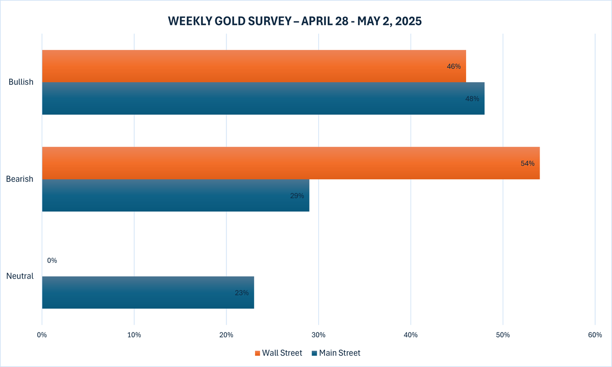 Tuần này, 13 nhà phân tích đã tham gia Khảo sát vàng của Kitco News, với phần lớn Phố Wall hiện đang có thái độ bi quan đối với kim loại quý này. Sáu chuyên gia, hay 46%, dự kiến giá vàng sẽ tăng trong tuần tới, trong khi bảy nhà phân tích, đại diện cho 54% còn lại, dự đoán giá vàng sẽ giảm. Không ai thấy vàng sẽ giữ ổn định vào tuần tới.
