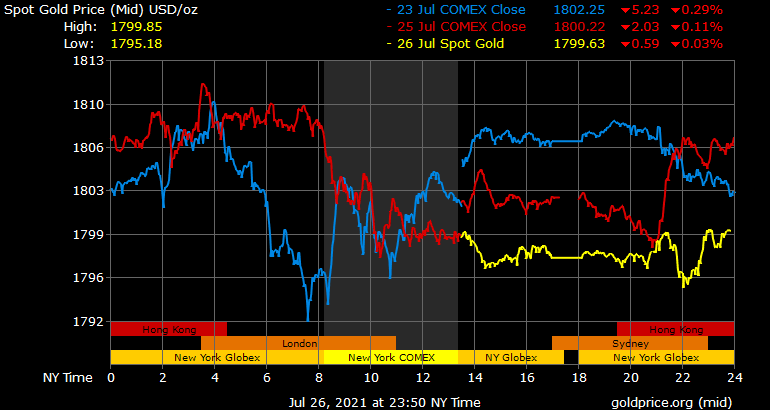 Trên thị trường vàng thế giới, giá vàng giao ngay chốt phiên đêm qua tại Mỹ giảm 4,7 USD xuống 1.797,5 USD/ounce. Sang phiên châu Á sáng nay, giá vàng hồi phục và áp sát 1.800 USD/ounce.