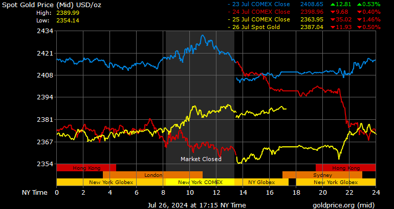 Giá vàng tương lai giao tháng 8/2024 trên sàn Comex New York tăng 27,5 USD, tương ứng tăng 1,17% lên mức 2.381 USD/ounce.