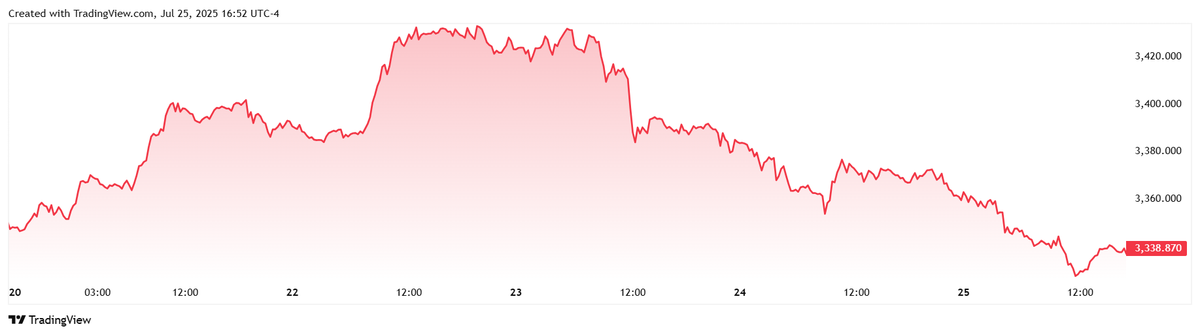 Vàng có diễn biến gần như đối lập nhau trên biểu đồ giá hàng tuần, khi khởi đầu tuần với đà tăng mạnh mẽ trên 3.400 USD/ounce trước khi tâm lý thị trường thay đổi khiến nhiều nhà đầu tư chốt lời, đẩy giá xuống gần mức hỗ trợ 3.300 USD/ounce.
