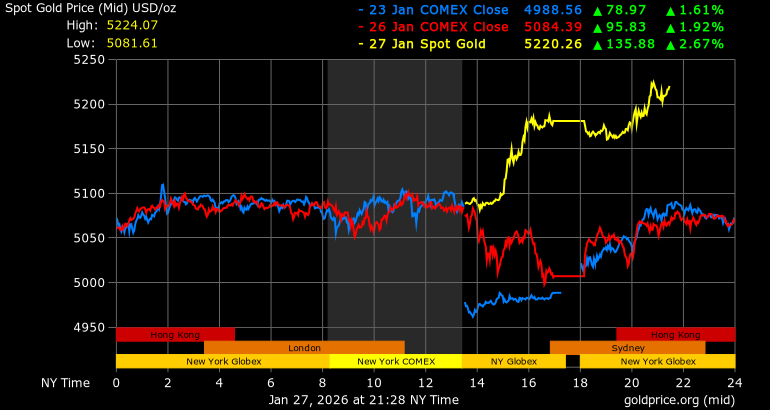 Trên thị trường vàng thế giới, giá vàng giao ngay chốt phiên hôm qua tại Mỹ tăng mạnh 171,8 USD, tương ứng tăng 3,43% lên mức 5.180,6 USD/ounce. Sang phiên châu Á sáng nay, giá vàng tiếp tục tăng 39,1 USD lên mức 5.219,7 USD/ounce.