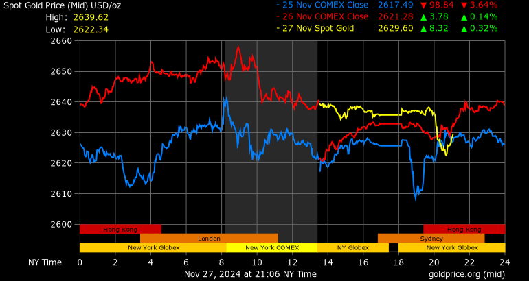 Giá vàng tương lai giao tháng 12/2024 trên sàn Comex New York tăng 18,6 USD, tương ứng tăng 0,71% lên mức 2.639,9 USD/ounce.