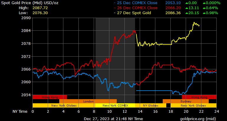 Giá vàng tương lai giao tháng 2/2024 trên sàn Comex New York tăng 23,3 USD, tương ứng tăng 1,13% lên 2.093,1 USD/ounce.