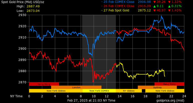 Giá vàng tương lai giao tháng 4/2025 trên sàn Comex New York giảm 34,7 USD, tương ứng giảm 1,18% xuống mức 2.895,9 USD/ounce.