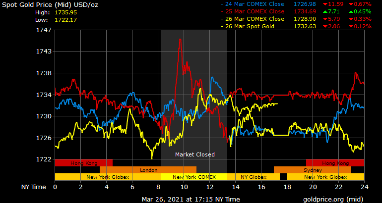 Trên thị trường vàng thế giới, giá vàng giao ngay chốt phiên cuối tuần tại Mỹ tăng 6,6 USD lên 1.733,3 USD/ounce. Giá vàng tương lai giao tháng 4 trên sàn Comex New York tăng 6,5 USD lên 1.731,6 USD/ounce.