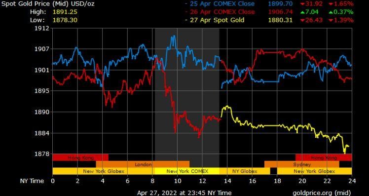 Giá vàng tương lai giao tháng 6/2022 trên sàn Comex New York giảm 15,4 USD xuống mức 1.888,7 USD/ounce.