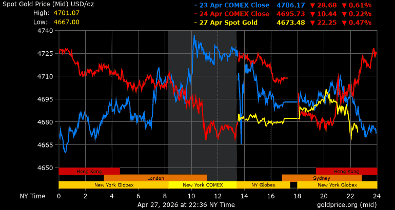 Trên thị trường vàng thế giới, giá vàng giao ngay chốt phiên hôm qua tại Mỹ giảm 27,8 USD, tương ứng giảm 0,59% xuống mức 4.682 USD/ounce. Sang phiên châu Á sáng nay, giá vàng tiếp tục giảm 8,8 USD xuống mức 4.673,1 USD/ounce.