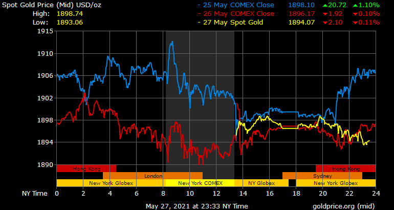 Giá vàng tương lai giao tháng 6 trên sàn Comex New York giảm 1,9 USD xuống 1.893,8 USD/ounce.