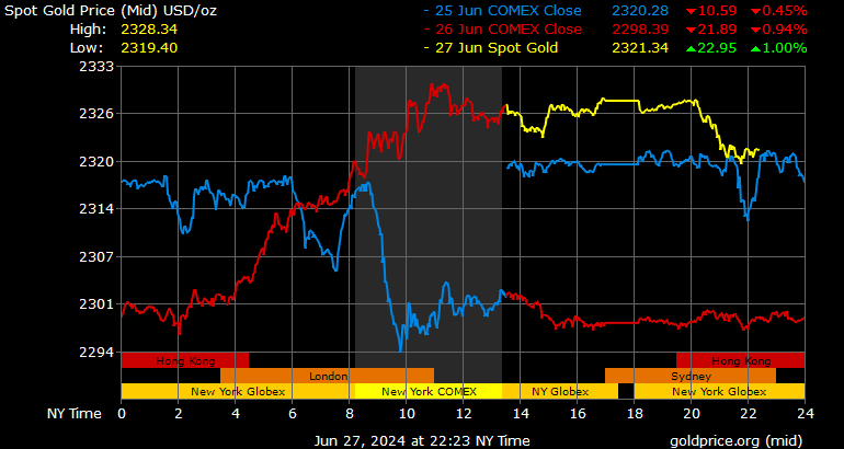 Trên thị trường vàng thế giới, giá vàng giao ngay chốt phiên hôm qua tại Mỹ tăng 29,3 USD lên 2.327,8 USD/ounce. Sang phiên châu Á sáng nay, giá vàng đảo chiều giảm 6,3 USD xuống 2.321,5 USD/ounce.