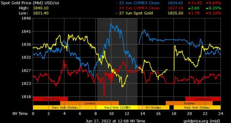 Giá vàng tương lai giao tháng 8/2022 trên sàn Comex New York giảm 5,5 USD xuống 1.824,8 USD/ounce.