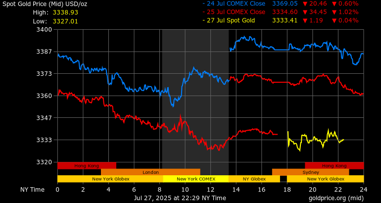 Giá vàng tương lai giao tháng 8/2025 trên sàn Comex New York giảm 37,9 USD, tương ứng giảm 1,12% xuống mức 3.335,6 USD/ounce.