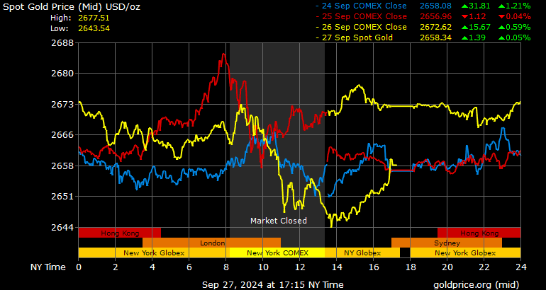 Giá vàng tương lai giao tháng 12/2024 trên sàn Comex New York giảm 26,8 USD, tương ứng giảm 0,99% xuống mức 2.668,1 USD/ounce.