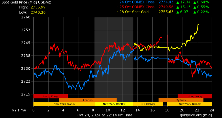 Giá vàng tương lai giao tháng 12/2024 trên sàn Comex New York tăng nhẹ 1,3 USD, tương ứng tăng 0,05% lên mức 2.755,9 USD/ounce.