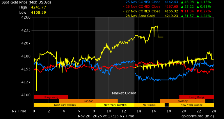 Trên thị trường vàng thế giới, giá vàng giao ngay chốt phiên hôm qua tại Mỹ tăng 57 USD, tương ứng tăng 1,37% lên mức 4.215,8 USD/ounce.