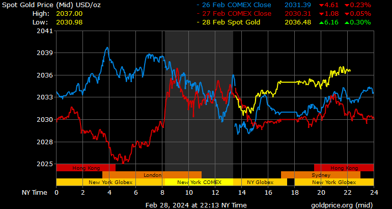 Giá vàng tương lai giao tháng 4/2024 trên sàn Comex New York giảm nhẹ 1,4 USD, tương ứng giảm 0,07% xuống mức 2.042,7 USD/ounce.