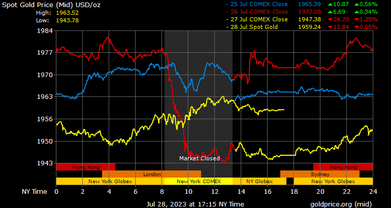 Giá vàng tương lai giao tháng 8/2023 trên sàn Comex New York tăng 14,7 USD, tương ứng tăng 0,76% lên 1.960,4 USD/ounce.