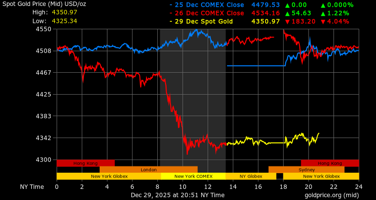 Giá vàng tương lai giao tháng 2/2026 trên sàn Comex New York giảm mạnh 209,1 USD, tương ứng giảm 4,59% xuống mức 4.343,6 USD/ounce.