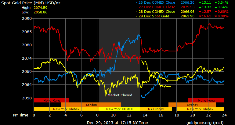Giá vàng tương lai giao tháng 2/2024 trên sàn Comex New York giảm 11,7 USD, tương ứng giảm 0,56% xuống 2.071,8 USD/ounce.