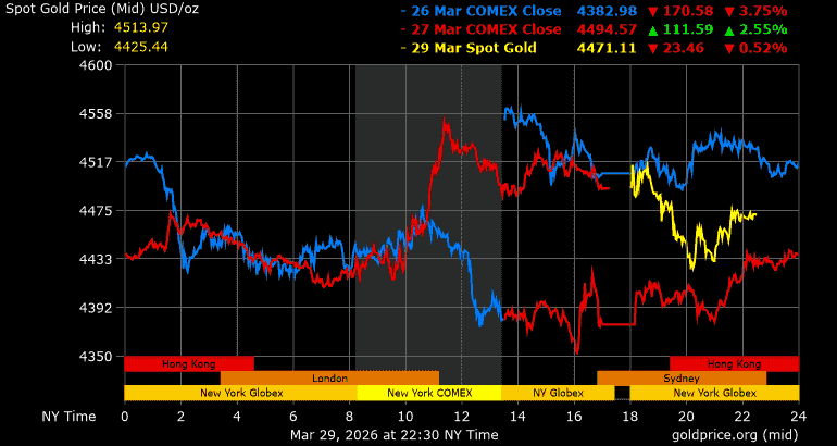 Trên thị trường vàng thế giới, giá vàng giao ngay chốt phiên cuối tuần qua tại Mỹ tăng 115,5 USD, tương ứng tăng 2,64% lên mức 4.493,7 USD/ounce. Sang phiên châu Á sáng nay, giá vàng đảo chiều giảm 31 USD xuống mức 4.462,7 USD/ounce.