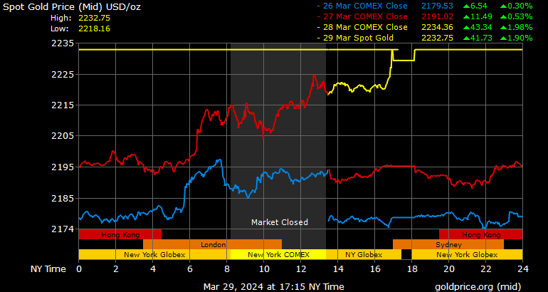 Trên thị trường vàng thế giới, giá vàng giao ngay chốt phiên hôm qua tại Mỹ tăng 38,3 USD lên 2.233,1 USD/ounce.