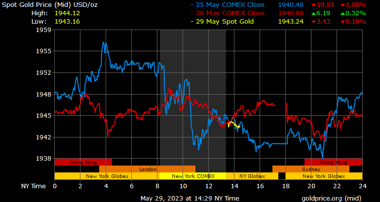Giá vàng tương lai giao tháng 6/2023 trên sàn Comex New York tăng nhẹ 0,6 USD, tương ứng tăng 0,03% lên 1.944,3 USD/ounce.
