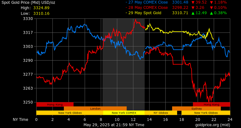 Giá vàng tương lai giao tháng 6/2025 trên sàn Comex New York tăng 22,2 USD, tương ứng tăng 0,67% lên mức 3.317,1 USD/ounce.