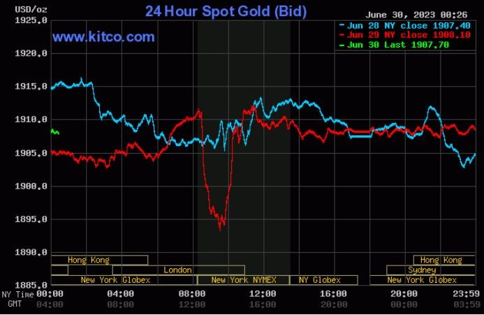 Giá vàng tương lai giao tháng 8/2023 trên sàn Comex New York giảm 4,3 USD, tương ứng giảm 0,22% xuống 1.917,9 USD/ounce.