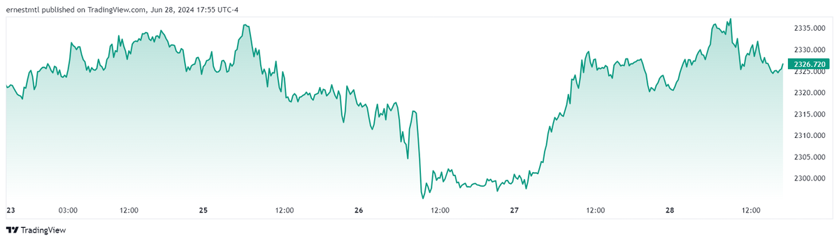 Giá vàng tương lai giao tháng 8/2024 trên sàn Comex New York tăng 3 USD, tương ứng tăng 0,13% lên mức 2.339,6 USD/ounce. Tính chung cả tuần, giá vàng giao ngay tăng 8,4 USD/ounce, tương ứng tăng 0,36%.