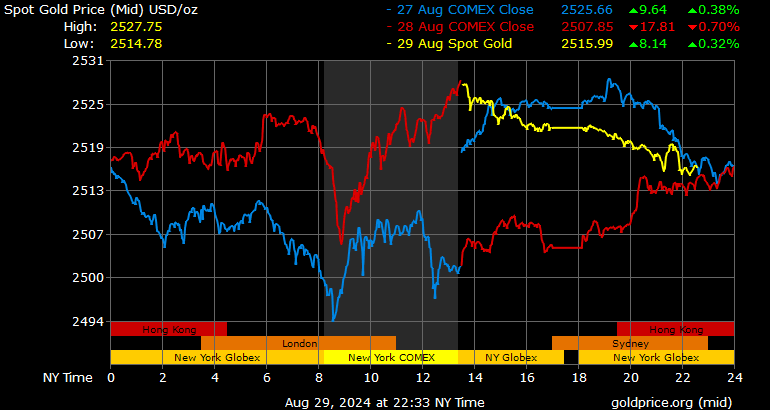 Trên thị trường vàng thế giới, giá vàng giao ngay chốt phiên hôm qua tại Mỹ tăng 16,5 USD lên 2.521,2 USD/ounce. Sang phiên châu Á sáng nay, giá vàng đảo chiều giảm 5,2 USD xuống 2.516 USD/ounce.