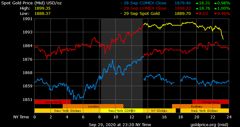 Trên thị trường vàng thế giới, giá vàng giao ngay chốt phiên đêm qua tại Mỹ tăng 16,1 USD lên 1.897.3 USD/ounce. Sang phiên châu Á sáng nay, giá vàng giảm xuống gần 1.889 USD/ounce. Giá vàng tương lai giao tháng 10 trên sàn Comex New York giảm 3,7 USD xuống 1.890,6 USD/ounce.