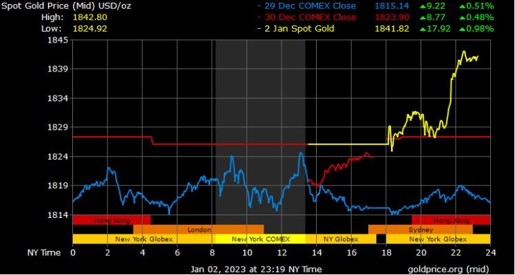 Trên thị trường vàng thế giới, giá vàng giao ngay chốt phiên cuối cùng của năm 2022 tại Mỹ tăng 9,1 USD lên 1.824,5 USD/ounce. Sang phiên châu Á sáng nay, giá vàng tiếp tục tăng vọt lên mức 1.842,2 USD/ounce.