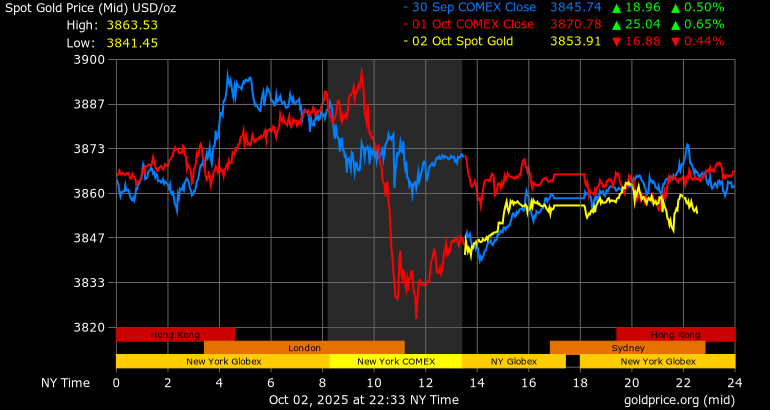 Trên thị trường vàng thế giới, giá vàng giao ngay chốt phiên hôm qua tại Mỹ giảm 9 USD, tương ứng giảm 0,23% xuống mức 3.856,6 USD/ounce. Sang phiên châu Á sáng nay, giá vàng tiếp tục giảm nhẹ 3,2 USD xuống 3.853,3 USD/ounce.