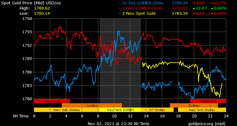 Trên thị trường vàng thế giới, giá vàng giao ngay chốt phiên đêm qua tại Mỹ giảm 5,8 USD xuống 1.787,7 USD/ounce. Sang phiên châu Á sáng nay, giá vàng giảm nhanh xuống gần 1.780 USD/ounce.