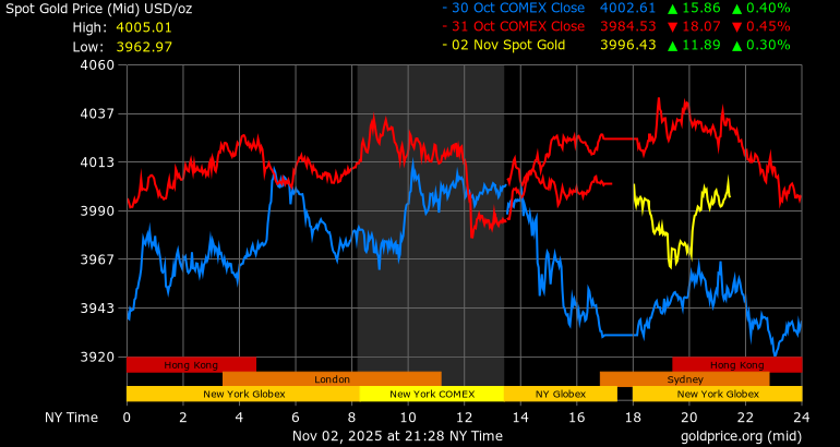 Trên thị trường vàng thế giới, giá vàng giao ngay chốt phiên cuối tuần qua tại Mỹ giảm 21,7 USD, tương ứng giảm 0,54% xuống mức 4.002,8 USD/ounce. Sang phiên châu Á sáng nay, giá vàng tiếp tục giảm 6,3 USD xuống 3.996,5 USD/ounce.