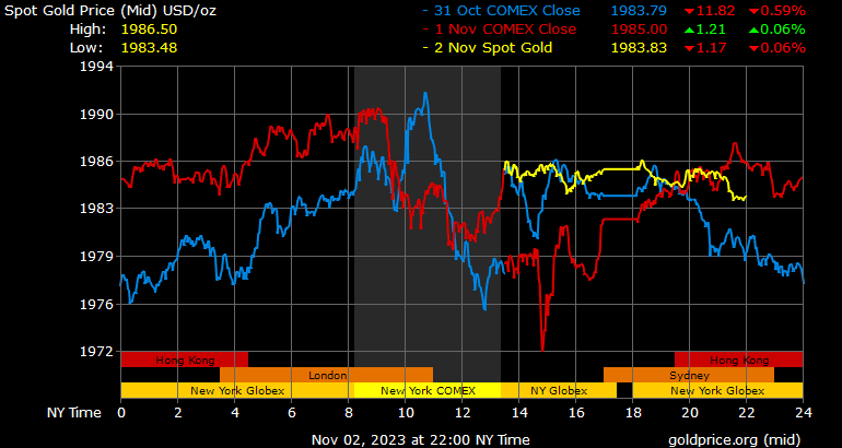 Trên thị trường vàng thế giới, giá vàng giao ngay chốt phiên hôm qua tại Mỹ tăng 2,6 USD lên 1.985,1 USD/ounce. Sang phiên châu Á sáng nay, giá vàng đảo chiều giảm nhẹ xuống 1.983,3 USD/ounce.