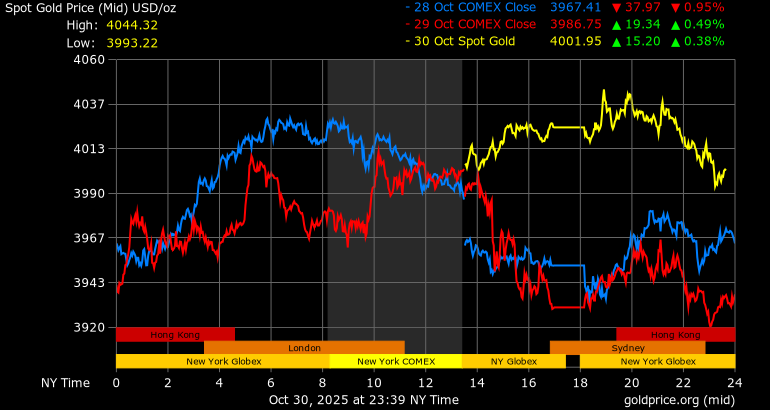 Trên thị trường vàng thế giới, giá vàng giao ngay chốt phiên hôm qua tại Mỹ tăng mạnh 93,9 USD, tương ứng tăng 2,39% lên mức 4.024,5 USD/ounce. Sang phiên châu Á sáng nay, giá vàng đảo chiều giảm 21,9 USD xuống 4.002,6 USD/ounce.