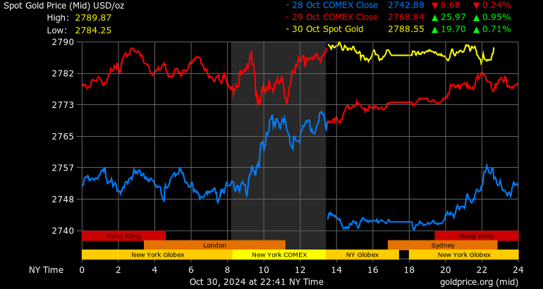 Trên thị trường vàng thế giới, giá vàng giao ngay chốt phiên hôm qua tại Mỹ tăng 12,9 USD lên 2.787,5 USD/ounce. Sang phiên châu Á sáng nay, giá vàng tiếp tục tăng nhẹ 1,3 USD lên 2.788,8 USD/ounce.