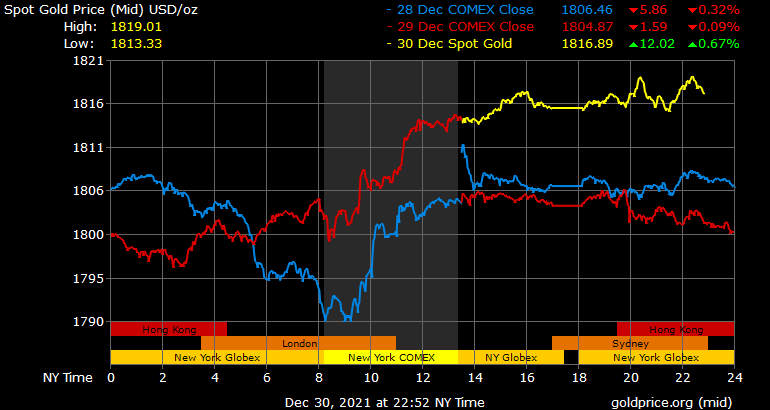 Trên thị trường vàng thế giới, giá vàng giao ngay chốt phiên đêm qua tại Mỹ tăng 9,7 USD lên 1.814,5 USD/ounce. Sang phiên châu Á sáng nay, giá vàng nhích nhẹ lên trên 1.816 USD/ounce.