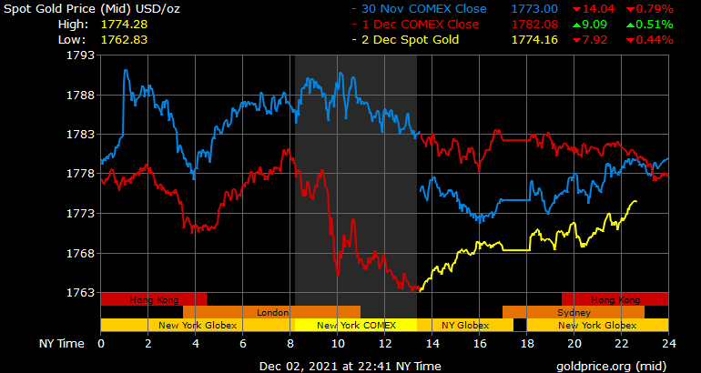Trên thị trường vàng thế giới, giá vàng giao ngay chốt phiên đêm qua tại Mỹ giảm 8 USD xuống 1.774 USD/ounce. Giá vàng tương lai giao tháng 1/2022 trên sàn Comex New York tăng hơn 11 USD lên 1.773 USD/ounce.