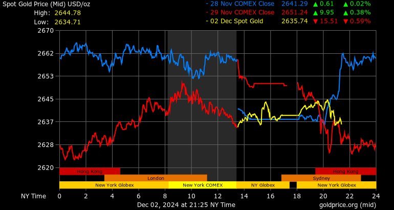 Trên thị trường vàng thế giới, giá vàng giao ngay chốt phiên hôm qua tại Mỹ giảm 13,4 USD xuống 2.639 USD/ounce. Sang phiên châu Á sáng nay, giá vàng tiếp tục giảm nhẹ 2,8 USD xuống 2.636,2 USD/ounce.