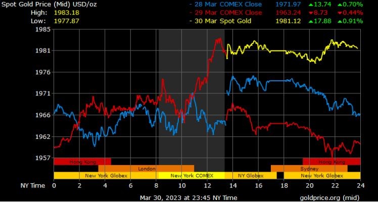 Giá vàng tương lai giao tháng 4/2023 trên sàn Comex New York tăng 13,4 USD, tương ứng tăng 0,68% lên 1.980,3 USD/ounce.