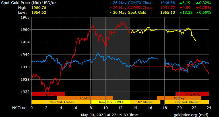 Giá vàng tương lai giao tháng 8/2023 trên sàn Comex New York tăng 14 USD, tương ứng tăng 0,71% lên 1.977,1 USD/ounce.