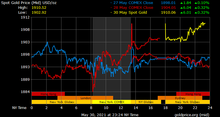 Trên thị trường vàng thế giới, giá vàng giao ngay chốt phiên cuối tuần qua tại Mỹ tăng 7,6 USD lên 1.903,5 USD/ounce. Sang phiên châu Á sáng nay, giá vàng tăng nhanh lên trên 1.910 USD/ounce.