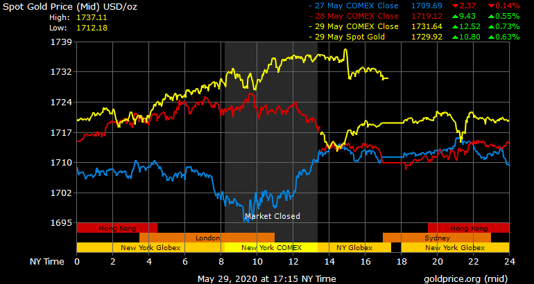 Trên thị trường vàng thế giới, giá vàng giao ngay chốt phiên cuối tuần qua tại Mỹ tăng 9,7 USD lên 1.728,7 USD/ounce. Giá vàng tương lai giao tháng 6 trên sàn Comex New York tăng 18,3 USD lên 1.731,6 USD/ounce.