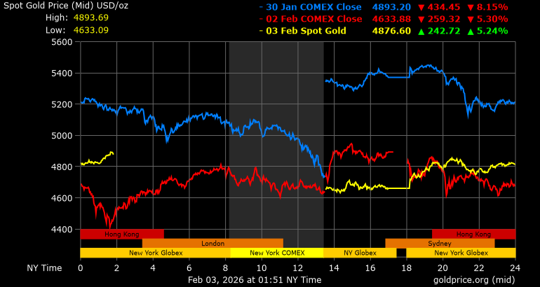 Trên thị trường vàng thế giới, giá vàng giao ngay chốt phiên hôm qua tại Mỹ giảm 234,4 USD, tương ứng giảm 4,79% xuống mức 4.661,1 USD/ounce. Sang phiên châu Á sáng nay, giá vàng đảo chiều tăng 205,1 USD lên mức 4.866,2 USD/ounce.